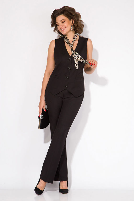 Жилетка полупрниталенного силуэта, с застежкой на пуговицы выполнена из костюмной ткани. По полочке расположены продольные рельефы с прорезными карманами. Спинка выполнена из шелкового сатина с эффектным принтом. Есть хлястик для приталивания. Жилетка на шелковой подкладке. Брюки в костюме со средней посадкой на притачном поясе-кокетке со вставками из отделочной ткани. Застежка потайная тесьма-молния. По спинке имеется резинка. Брюки слегка заужены в области колена. Строгость и утонченность - основные характеристики женской костюмной двойки.