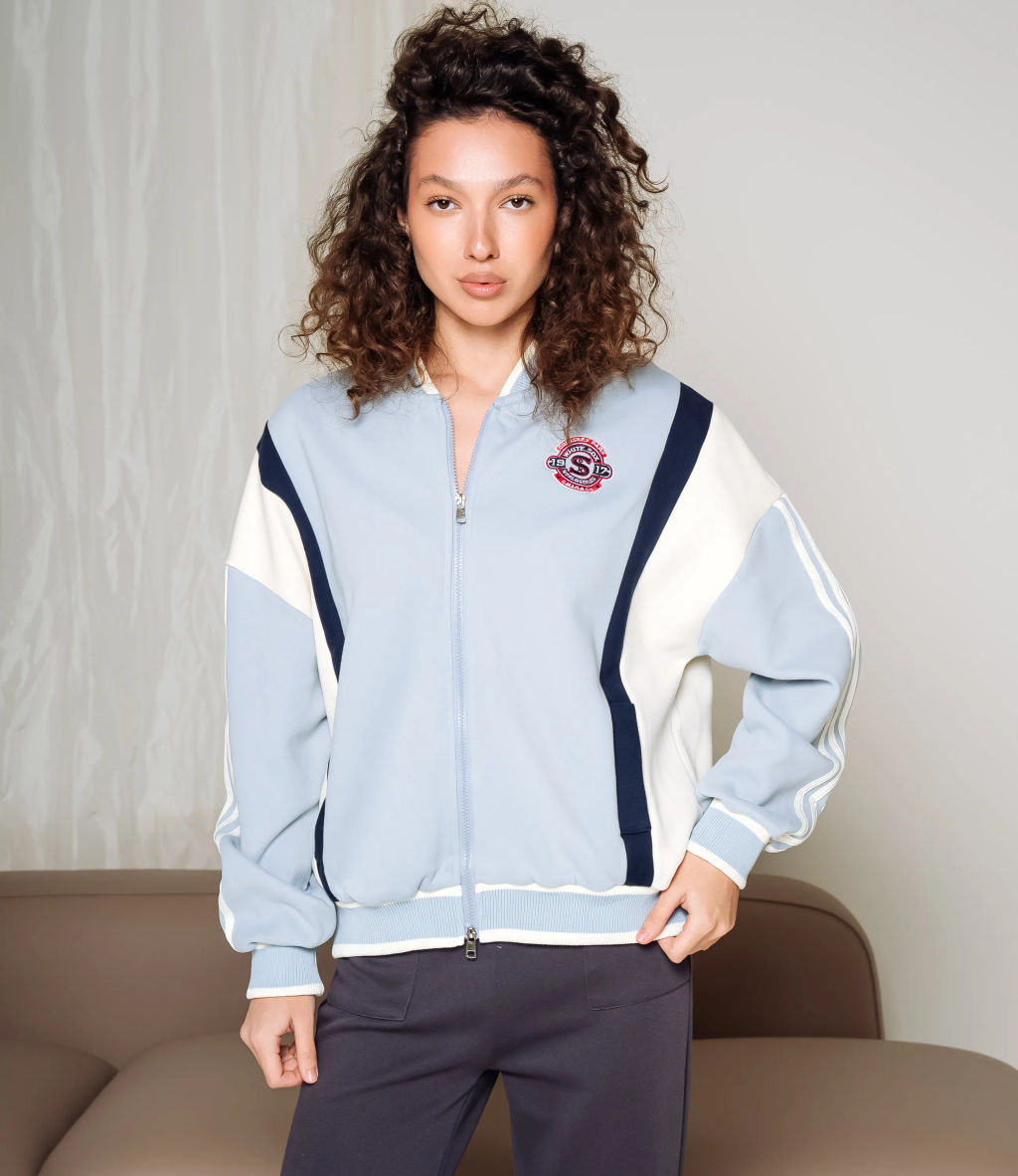 Бомбер это одежда, которая выделяет уникальность любой девушки. Бомбер выполнена в классическом коротком силуэте. Плотный трикотаж средней толщины, укороченный силуэт до линии бедер с лёгким объёмом, центральная застёжка?молния с металлическим бегунком, воротник?стойка средней высоты, эластичные манжеты и низ с присборенным краем, втачные рукава с декоративными продольными лентами и контрастными боковыми вставками, небольшая круглая вышивка на груди. Для изготовления использована ткань из 80% хлопка и 20% полиэстера, которая характеризуется безупречным качеством. Даже после многих стирок изделие не утратит первоначальной индивидуальности. Вы обязательно будете ее носить с большим удовольствием. Обратите внимание на насыщенный оттенок. Он полностью соответствует фотографии на сайте. Чтобы вы были уверены в размере, мы представили на странице таблицу. Воспользовавшись ею, вы сможете сами сделать мерки и удостовериться. Предложенная нами цена является доступной. Не откажите себе в удовольствии быть неповторимой! -- Характеристики -- Цвет: голубой Пол: Женский Страна производитель: Китай Сезон: Демисезон Материал: Хлопок, Полиэстер