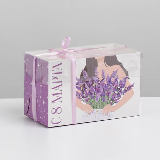 • Цена за 5 шт. Коробка для капкейков, кондитерская упаковка с пластиковой крышкой, 2 ячейки, 8 марта, 16?8?10 см