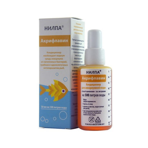 Кондиционер Акрифлавин от патогенных бактерий и одноклеточных экзопаразитов в аквариумной воде оказывает оздоравливающее действие на водную среду. Препятствует размножению грибков родов сапролегния и ахлия.
