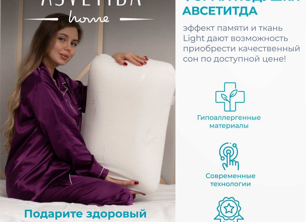 Подушка анатомическая с эффектом памяти Асветида Light 50*70 обладает классической формой с закругленными краями. Это обеспечивает правильное положение головы и шеи во время сна. Благодаря вспененной структуре наполнителя, анатомическая подушка эластичная, что способствует комфортному и здоровому сну. В составе пена с эффектом памяти – это инновационный материал, который называется пенополиуретан. Благодаря материалу «Мемори», или как его еще называют «Мemory Foam», мышцы шеи полностью расслабляются во время сна, а шейный отдел позвоночника остается в правильном положении. Анатомическая форма позволяет принять комфортное положение во время сна на боку, на животе или на спине. Кроме того, подушка предотвращает отеки лица, которые могут возникнуть при неправильном положении головы. Абсолютно гипоаллергенная, так как она изготовлена из дышащих экологически чистых материалов. Благодаря этому поддерживается комфортная температура покрытия во время сна. Подушка Асветида Light помогает решить такие проблемы как: • храп; • бессонница; • головные боли; • боли в шее; • боли в спине. Для тех, кто заботится о своем здоровье и комфорте во время сна.