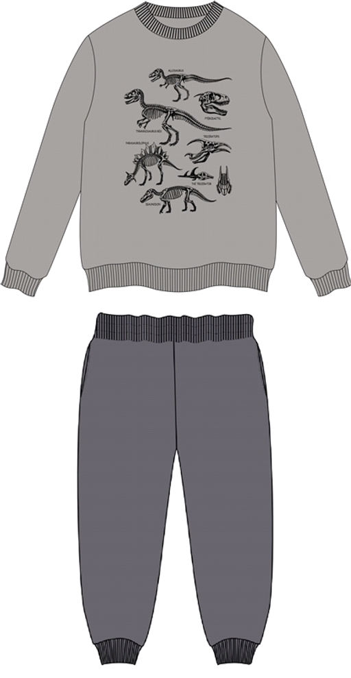 свитшот+брюки,хлопок 75% + ПЭ 20% + лайкра 5%,футер / хлопок 75% + ПЭ 20% + лайкра 5%,серый261+темно-серый235 / - / Мир динозавров / - / - / -,Костюм для мальчика, состоящий из свитшота и брюк, выполнен из футера - тонкого хлопкового полотна с содержанием полиэстера. Свитшот прямого силуэта со спущенными плечами и поясом по низу изделия. Рукава длинные с манжетами и напуском. Полочка украшена печатью. Брюки полуприлегающего силуэта, с манжетами по низу, с карманами в боковых швах. Уход: только машинная стирка (руками не стирать!) при температуре 40 градусов, без предварительного замачивания. Ассортимент осенне-зимнего периода.