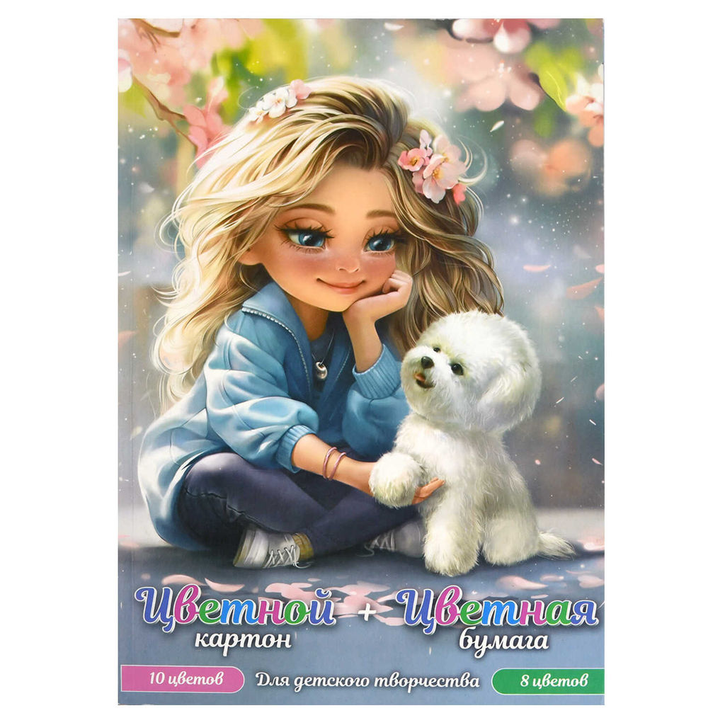 Цветной картон + цветная бумага арт. 69927 БЛОНДИНКА С СОБАЧКОЙ /А4, клеевое скрепление, 26 л, обложка - полноцветная печать, мелованный картон с серым оборотом 230 г/м?, блок - газетная бумага, мелованный картон с серым оборотом, 200 г/м?, 45 г/м?, 10 цветов картона (1+0, 8 цветов+золото, серебро), 8 цветов бумаги, 16 листов (1+1)/