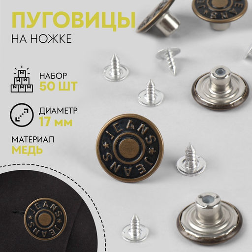 Набор: Да. В наборе, шт.: 50. Вид пуговицы: На шурупе. Тип: Наборы. Тип: Джинсовые. Размер пуговицы: 17 мм (26L). Бесплатная доставка: Да. Размеры товара: 6/3/10.