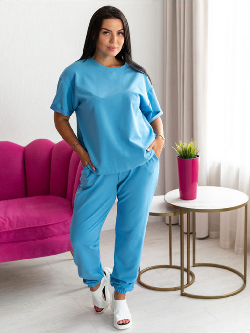 Костюм для отдыха, спорта, прогулок, шопинга для любого случая в жизни! Удобрый, комфортный, яркий, стильный. Модный минималистичный крой в стиле оверсайз сделает ваш образ актуальным долгое время. Блуза с коротким рукавом до локтя, с круглым вырезом горловины. Брюки с манжетой по низу, с боковыми карманами, с поясом на резинке. Костюм можно обыграть спортивной обувью и рюкзаком для прогулок в парке, босоножками и маленькой сумочкой для шопинга выбор остается за вами!­