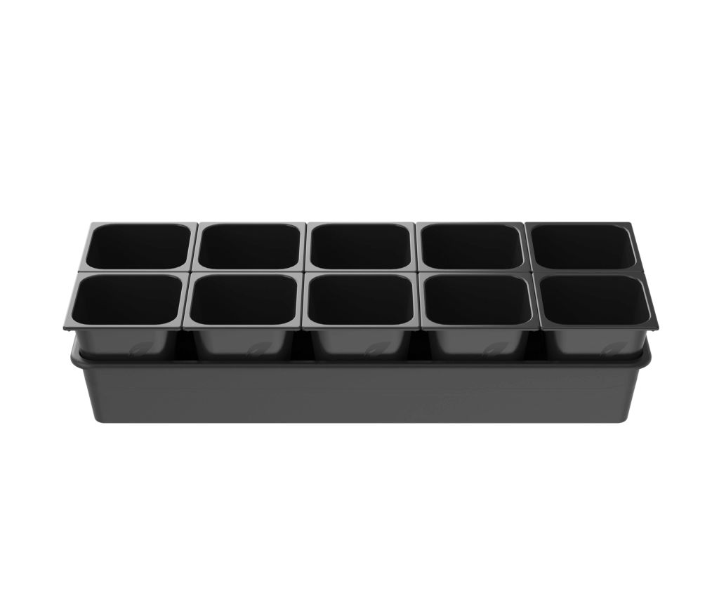 В наборе: 10 стаканчиков 1 л; 10 круглых вкладышей и ящик-поддон 10 л.