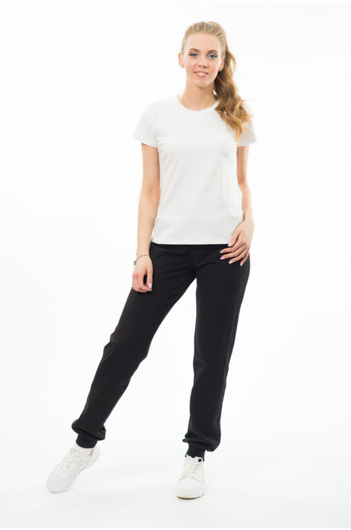 Брюки из плотного трикотажного полотна - футер.  Уютные брюки для женщин любой комплекции. Брюки прямого кроя, низ изделия обработан манжетом из кашкорсе. Задняя часть брюк декорирована кокеткой. Притачной пояс брюк на резинке делает их комфортными и удобными в носке. Изделие рекомендуется утюжить по изнанке. Брюки женские на манжете не зря считаются очень удобными и любимыми. Хлопковый состав позволяет коже дышать, а добавление лайкры позволяет вещам дольше сохранять товарный и презентабельный вид. Эти брюки универсальны в использовании: для дома, прогулок и отдыха на природе, для занятий спортом.­