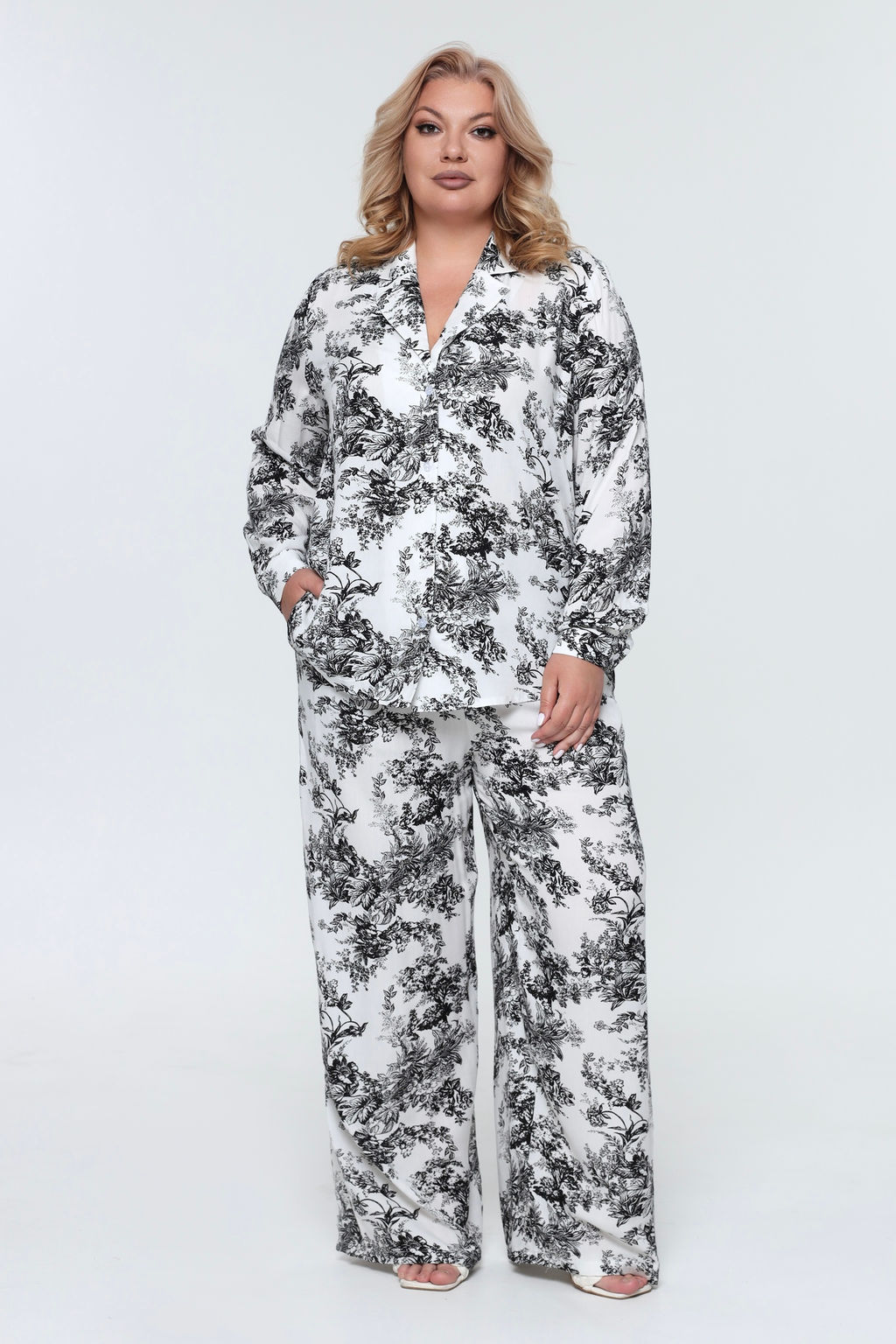 Удлиненная рубашка прямого кроя.  V-образный вырез оформлен классическим отложным воротником с лацканами. Рукава полной длины присобраны на манжету, которые застегиваются на пуговки. Модель застёгивается на пуговицы под планку. Кокетка на плечах способствует оптимальной посадке по фигуре. Оригинальный растительный принт добавляет динамичности и освежает образ. Костюм превосходно сочетается как с обувью на каблуках для создания нарядного образа, так и с кедами для более повседневного стиля. Элементы модели можно также носить по отдельности.