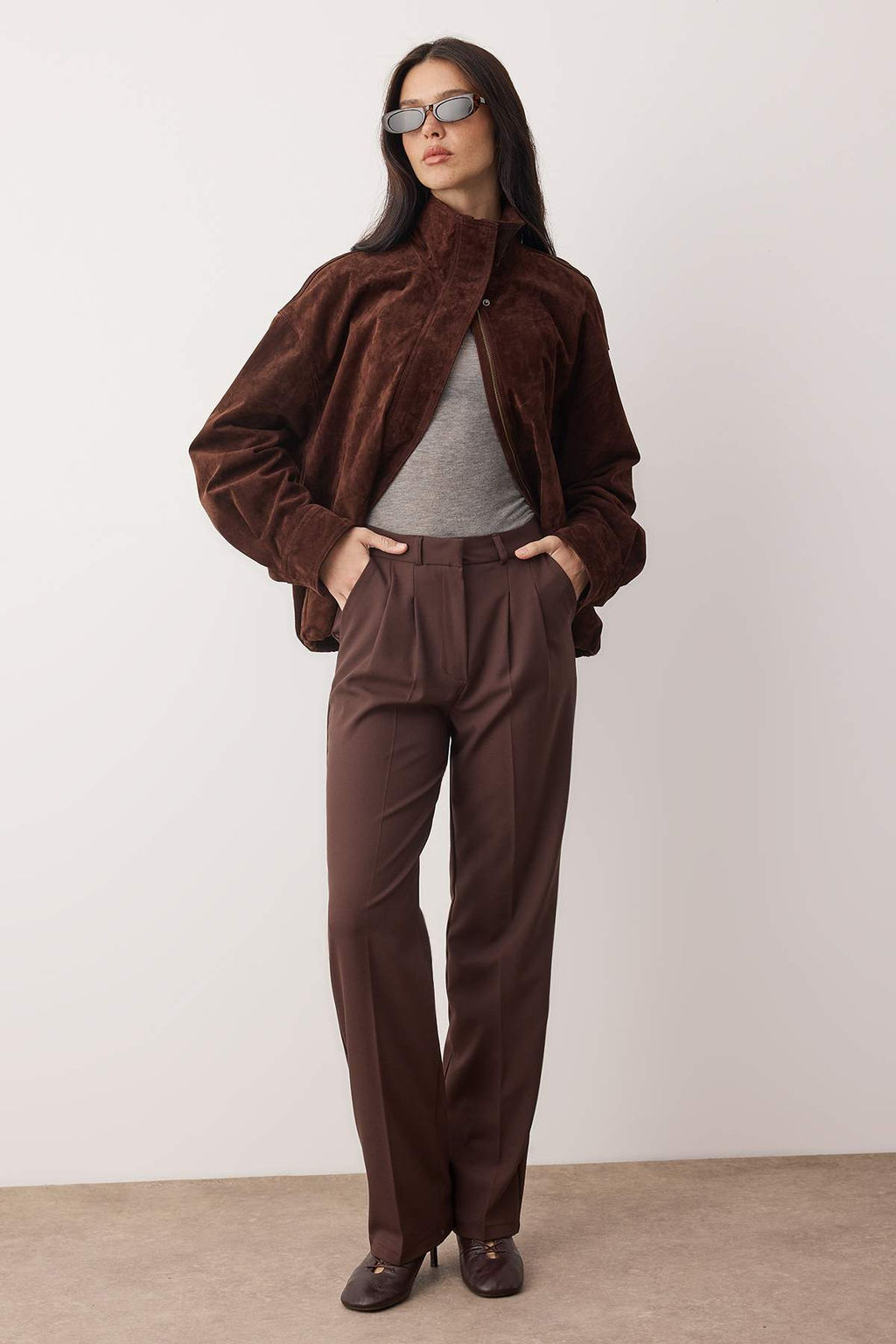 • Koyu Kahverengi Limited Edition Straight/Duz Kesim Pilili Dokuma Kumas Pantolon TWOAW23PL00401