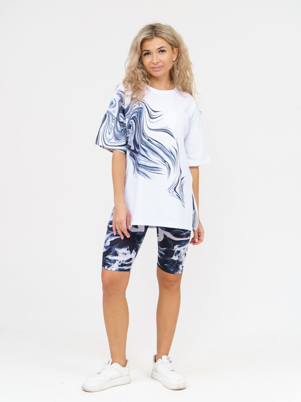 Стильный женский костюм двойка в стиле спорт-шик идеальное сочетание комфорта, уюта и модного дизайна. Этот трикотажный комплект состоит из длинной футболки оверсайз с ярким принтом и облегающих шорт-велосипедок, которые вместе создают гармоничный и женственный образ. Футболка свободного кроя с коротким рукавом и стильными разрезами по бокам идеально сочетается с велосипедками на эластичной резинке, которые мягко облегают фигуру, подчеркивая все преимущества силуэта. Высококачественное трикотажное полотно приятно к телу, обеспечивает комфорт и тепло в прохладную погоду, оставаясь легким и дышащим в теплое время года это действительно универсальный комплект, для которого смена сезонов не имеет значения.