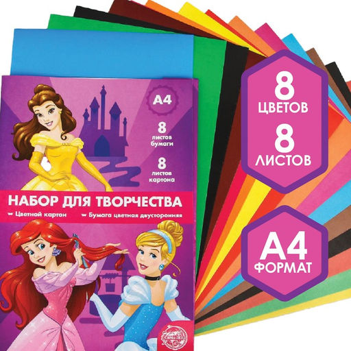 Набор для творчества «Принцессы» А4: 8 листов цветного одностороннего мелованного картона, 8 листов цветной двусторонней бумаги