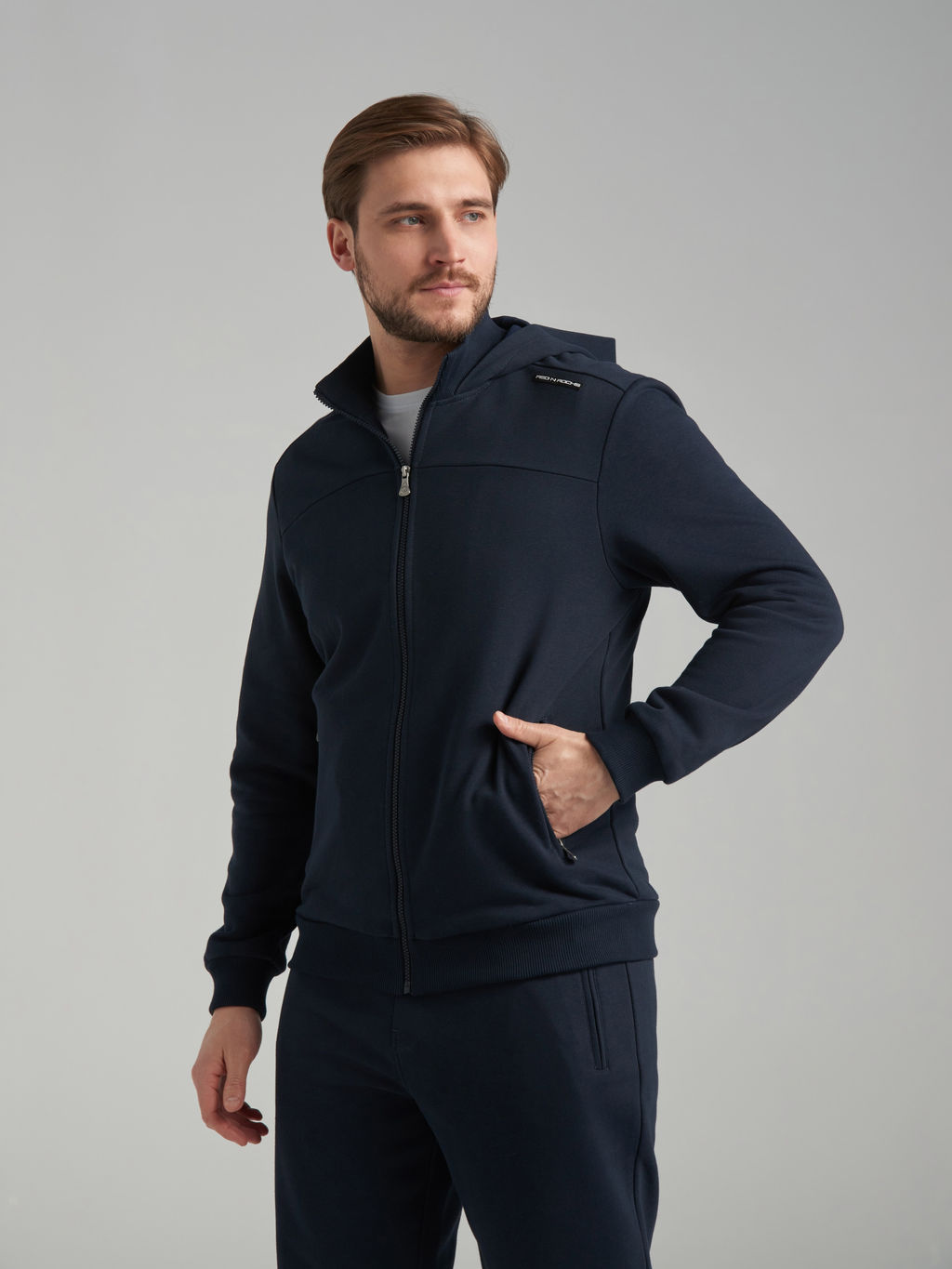 Мужско спортивный костюм из плотного хлопкового трикотажа с петельной изнанкой. Костюм состоит из куртки на молнии и брюк. Куртка свободного силуэта на поясе, с удобным капюшоном и воротником, рукава втачные. Карманы куртки и брюк с молниями. Низ брюк заужен на эластичную резинку. Задний карман брюк на молнии. В пояс брюк вшита резинка, ширина пояса дополнительно регулируется шнуром.