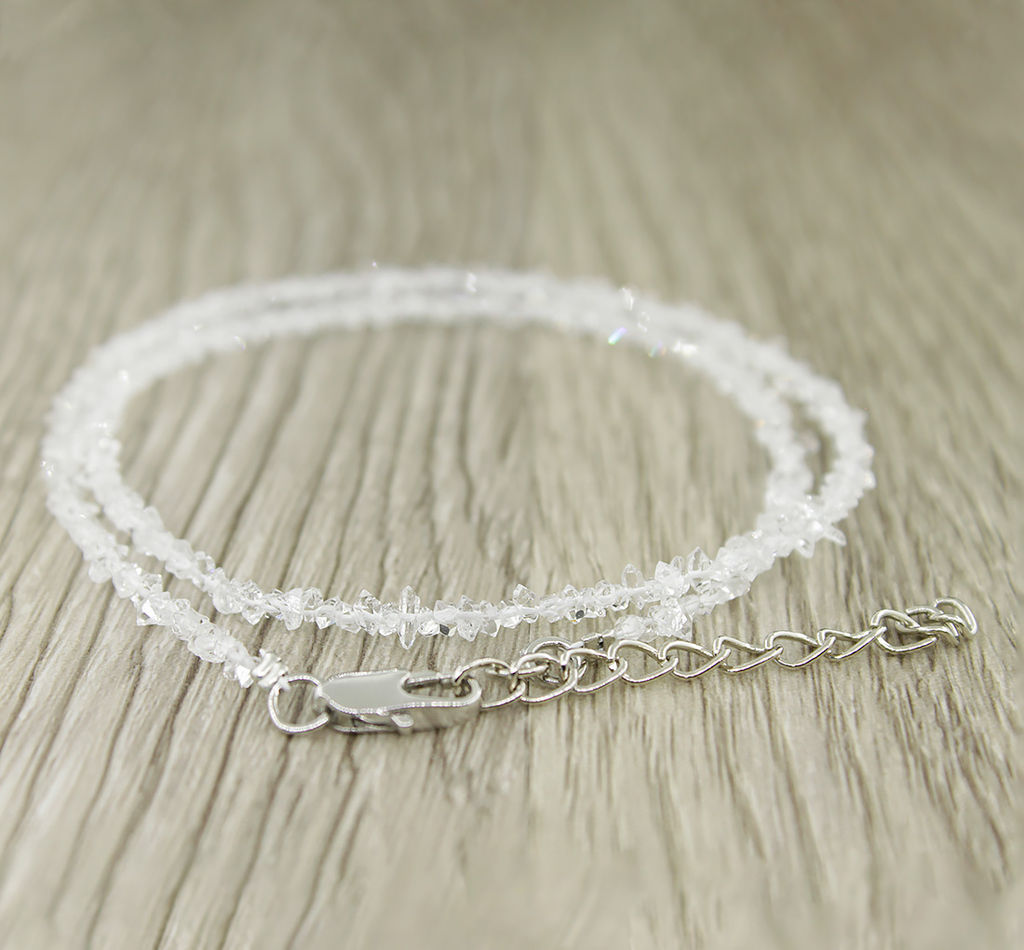 Изящные бусы из цельных кристаллов Херкимерского алмаза, напоминающие россыпь бриллиантов. Средняя длина бусин-кристаллов 3мм, длина 40...45см, регулируется удлиняющей цепочкой.