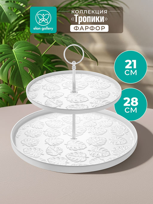 Блюдо-этажерка из серии Тропики от Elan Gallery предназначено для эстетичной сервировки вашего стола. Размер изделия 28х28х24 см. Состоит из 2 блюд: 21х21х1,8 см и 28х28х2 см. Выполнены из высококачественного белого фарфора. Он не впитывает цвет продуктов и легко отмывается, благодаря чему надолго сохраняет свою белизну. Поверхность украшена рельефным узором в виде тропических листьев. Закреплены на серебряной металлической оси. Расстояние между ярусами 10 см. Два яруса обеспечивают достаточно места для подачи различных закусок, фруктов и ягод. Разместите на сервировочных блюдах ваши любимые сладости: пирожные, печенья и кексы. Можно использовать в роли декоративной многоуровневой конфетницы для разнообразных лакомств. Положите на тарелочки сыр, колбасу или бутерброды, чтобы угостить гостей за праздничным столом. Не рекомендуется применять абразивные моющие средства. Без металлического крепления тарелки подходят для использования в посудомоечной машине и микроволновой печи. Поставляется в дизайнерской картонной коробке благодаря ей вам не потребуется дополнительная подарочная упаковка. Фарфоровая сервировочная посуда будет оригинальным подарком для хозяйки, ценящей не только практичность, но и привлекательность. Серия Тропики от бренда Элан Галерея станет украшением любого кухонного инвентаря и позволит собрать красивый сервиз в едином стиле!