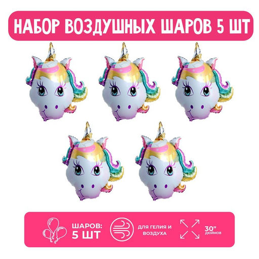 Воздушные шары фольгированные 30" «Голова, Волшебный Единорог», 5 шт.