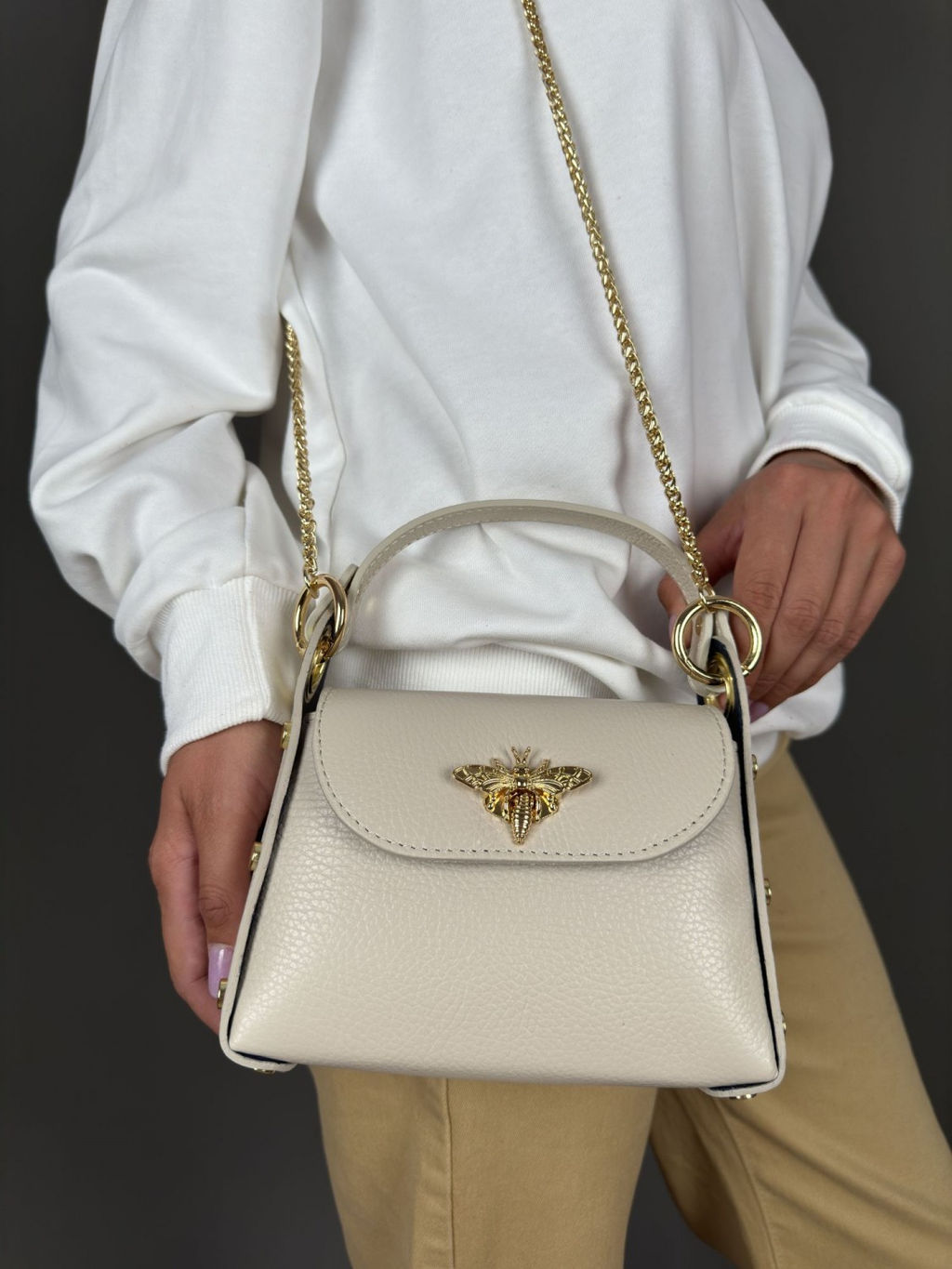 Страна: Италия Акции: Товары со скидкой Производитель: Pelletteria Luisa, Italy Размер: маленькая Стиль ношения: на ремешке через плечо Форма: жесткая Выделка кожи: зернистая износостойкая Цвет кожи: Бежевый Оттенок: светло-бежевый Палитра цветов: TB-101028 Размеры: длина: 18 см \tвысота: 12 см \tширина: 6 см \tвысота ручки: 9 см \t Описание: Красивая аккуратная необыкновенно модная женская сумка из натуральной кожи. Базовая коллекция Sefaro, Италия. Главные особенности модели: кросс-боди, замок в виде золотой бабочки, съемный плечевой ремень-цепочка, а также заклепки на боковых стенках сумки - используется фурнитура высокого итальянского качества в золотом цвете. Все эти элементы непременно привлекут к вам внимание окружающих своей яркостью и оригинальностью исполнения. Сумочка имеет каркасную форму, компактная, выполнена из зернистой телячьей кожи надежной и прочной в носке, может использоваться как повседневная модель, но подойдет и для торжественного случая - элегантно дополнит вечерний образ по типу клатча, либо подчеркнет сдержанный деловой, классический или даже винтажный стиль. Закрывается сумка внахлест на элегантную застежку с пряжкой, внутри один отдел, в котором поместится только самое необходимое. На дне сумки металлические защитные ножки. Можно носить в руке, на запястье, либо на изящной цепочке через плечо (длина 120см) - очень удобно!