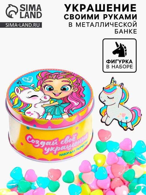Набор для творчества Создай своё украшение: Единорог идеальное решение для занятия творчеством! Бусины разных цветов так и манят создавать авторские изделия или оригинальные украшения, которые подойдут к любому наряду маленькой модницы. Особенности набора * Основу браслета представляет собой резинка, поэтому украшения будет легко снимать и надевать на руку, застёжки не потребуются. * В наборе разноцветные бусинки разных размеров. * Из набора можно сделать браслет или ожерелье с уникальным дизайном. * Все элементы выполнены из безопасного для детей пластика. Краска не содержит вредных веществ. * В металлической баночке можно хранить бусины и различные аксессуары. Как создать украшение * Отмерьте нужную длину резинки и отрежьте её от мотка. * Нанизывайте бусины на резиночку в том порядке, в каком захотите. * В конце завяжите резиночку на двойной крепкий узелок. * Ваше уникальный аксессуар готов! Увлекательно и полезно! Создание украшений способствует развитию воображения, усидчивости, изобретательности и мелкой моторики. Девочка с удовольствием будет воплощать свои идеи и радовать окружающих получившимися шедеврами. Набор рекомендован детям от 4 лет. Комплектация * Набор цветных бусин. * Резиночка. * Фигурка. * Инструкция.