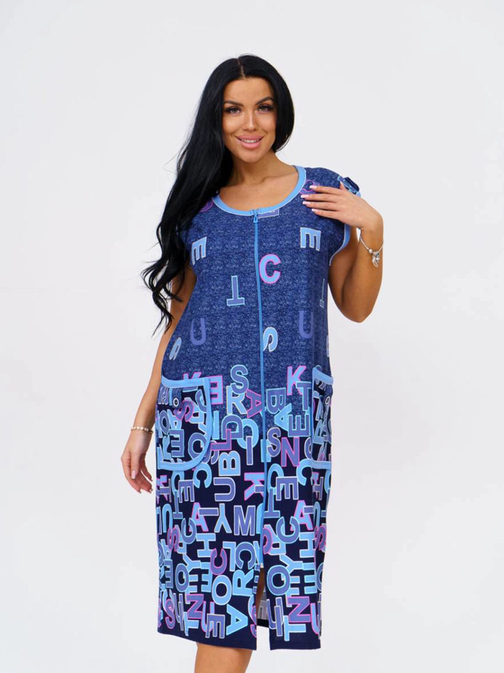 Халат женский из трикотажного полотна - кулирка, прямого силуэта с застёжкой на молиню. Полочка с накладными карманами, со вставками по плечевым срезам. Проймы, горловина и карманы обработаны окантовкой.­