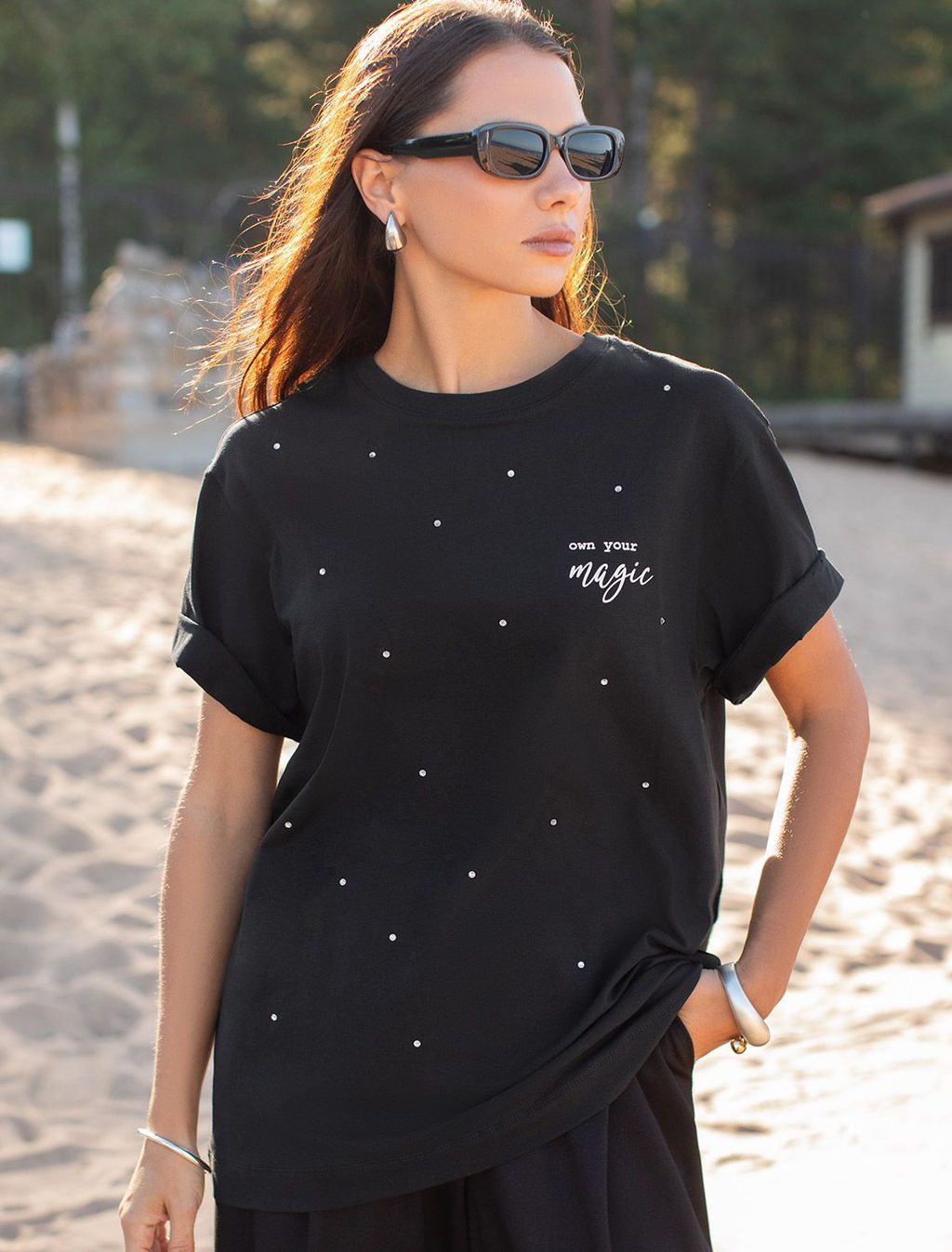 Футболка свободного кроя выполнена из премиального хлопка. Лаконичный принт нанесен красками с устойчивым покрытием и россыпью сияющих страз. Перевод: Own your magic - Твори свою магию Наличие эластана в составе гарантирует абсолютный комфорт и долговечность изделия. Модель дополнена металлическим логотипом бренда.­