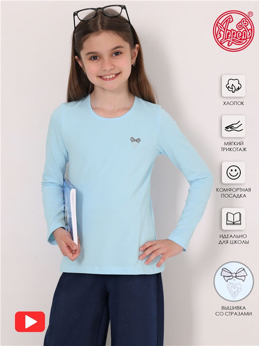 лонгслив,хлопок 92% + лайкра 8%,кулир с лайкрой / хлопок 92% + лайкра 8%,светло-голубой109 / - / Сердце с бантом вышивка / - / - / -,Лонгслив для девочки выполнен из кулира - легкого хлопкового полотна с лайкрой. Изделие с длинными рукавами, декорировано печатью, имитирующей кружевной воротничок. Незаменимый предмет гардероба для школьниц! Уход: только машинная стирка (руками не стирать!) при температуре 40 градусов, без предварительного замачивания. Изделия с печатью и декором перед стиркой необходимо вывернуть на изнаночную сторону.
