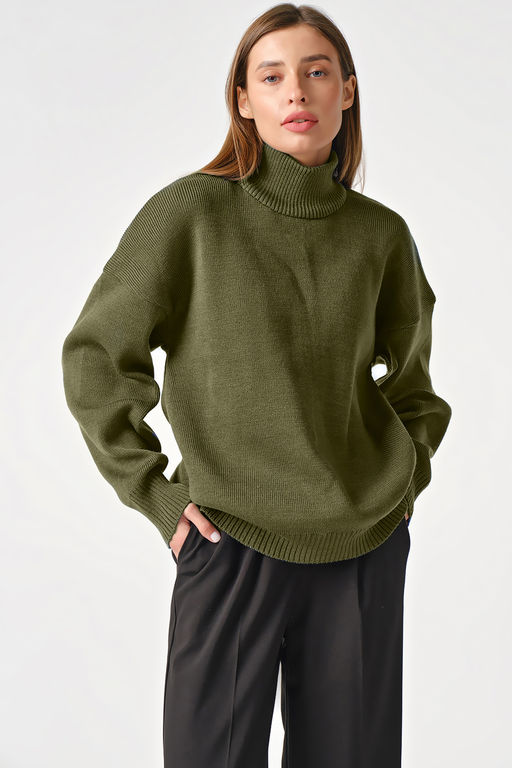 • Свитер вязаный теплый оверсайз с высоким горлом меланж оливковый