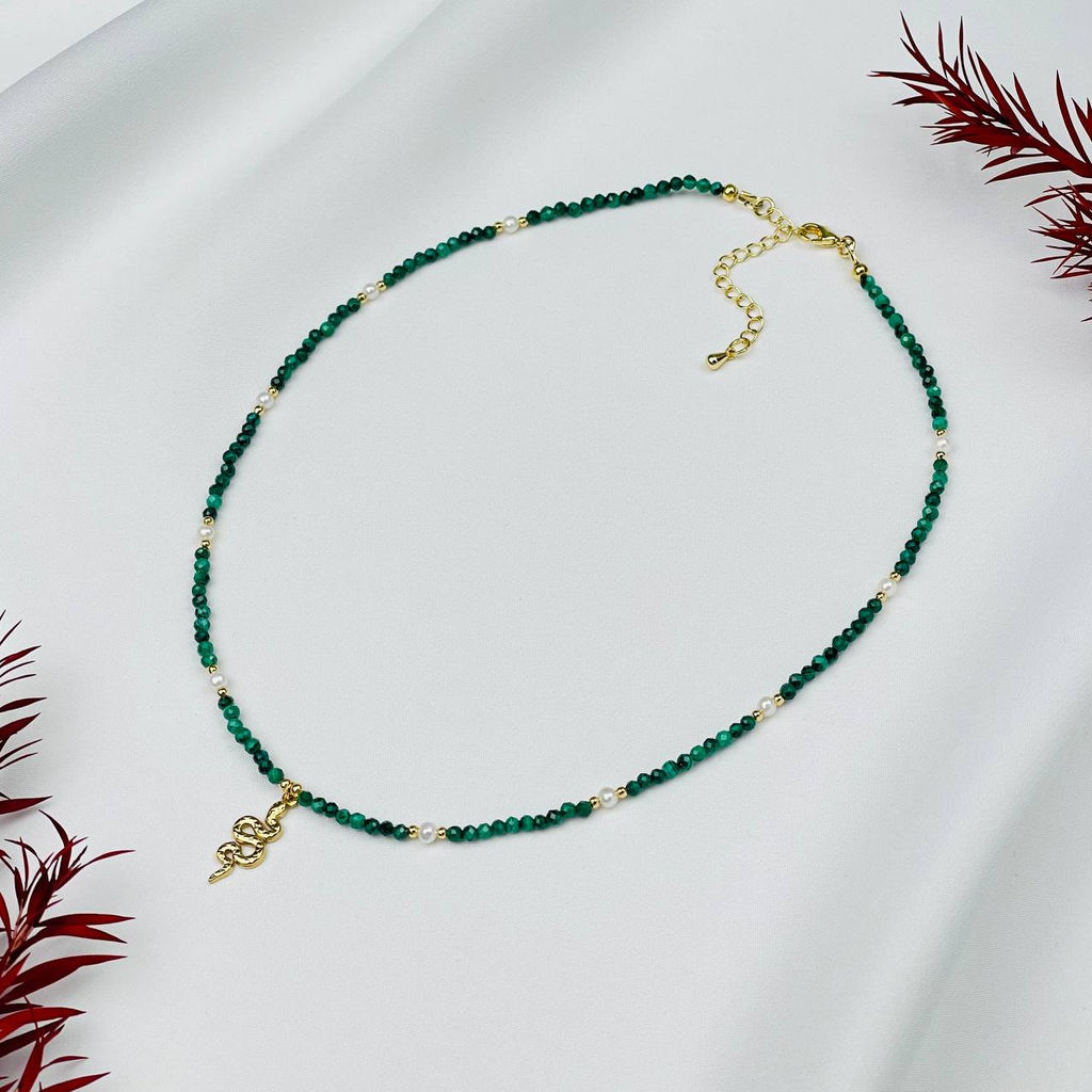 Колье из Малахита и Жемчуга с подвеской "Змея"