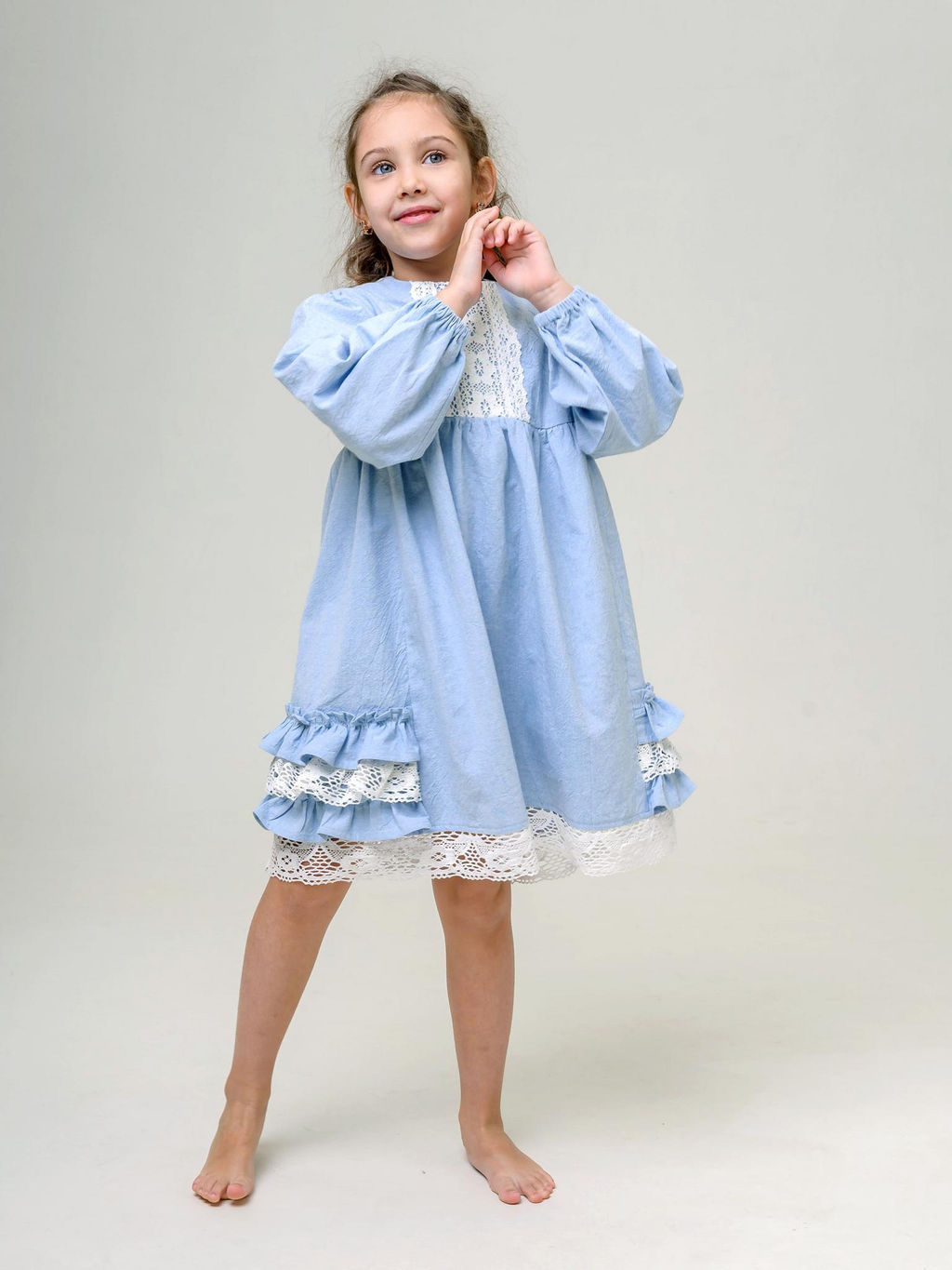 Нежное романтичное летнее платье  для девочки  выполнено из хлопковой  ткани нежно голубого цвета. Мы использовали новую технологию- ткань прошла специальную обработку(варку),сохранив натуральные свойства, она стала умягченная, безусадочная ,с эффектом мятости - креш.  Очень комфортное, свободного силуэта,с нежными рюшечками на юбке. Натуральные  кружева придают изделию  очень нарядный вид. Легкое, натуральное, нарядное платье,в котором ребенку будет комфортно и удобно как при повседневной носке, так и на любом торжестве. Застежка молния на спинке.