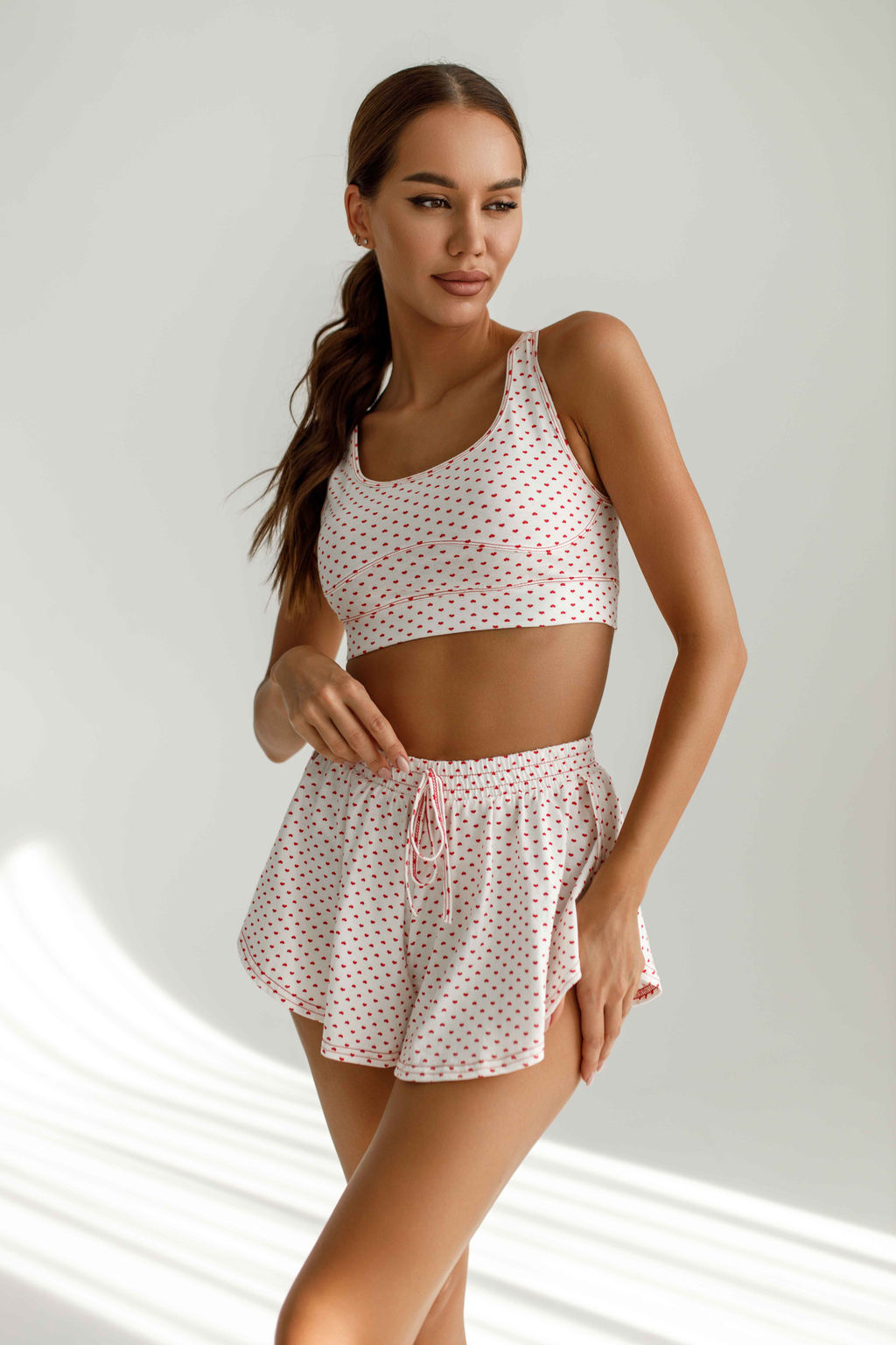 Эффектная пижама с шортиками из мягкой хлопковой ткани, которая нежно скользит по телу, снимая напряжение во время сна. Укороченный крой топа уравновешивается посадкой воздушных шорт с широкой плоской резинкой, подчеркивая женственные изгибы и обеспечивая максимальный комфорт во время сна.