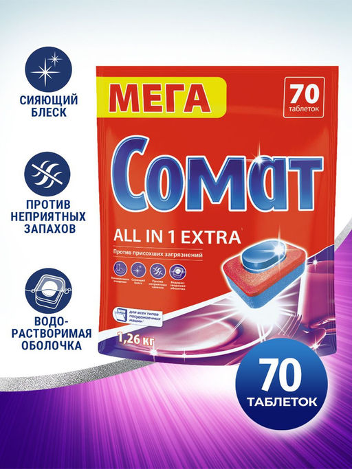 Таблетки для посудомоечной машины Сомат Всё в 1 Экстра содержат 10 активных действий, которые обеспечивают великолепное очищение Вашей посуды даже против таких трудных загрязнений, как присохшая еда, и заботятся о посудомоечной машине. Ослепительная чистота посуды без лишних усилий от Сомат. Откройте для себя чистящую силу таблеток Сомат Всё в 1 Экстра: великолепное очищение, против пятен от чая и кофе, быстро растворяется, против коррозии стекла и декора, действует при 45 градусах, забота о посудомоечной машине, функция ополаскивателя и соли, сияющий блеск, водорастворимая оболочка, против неприятных запахов.