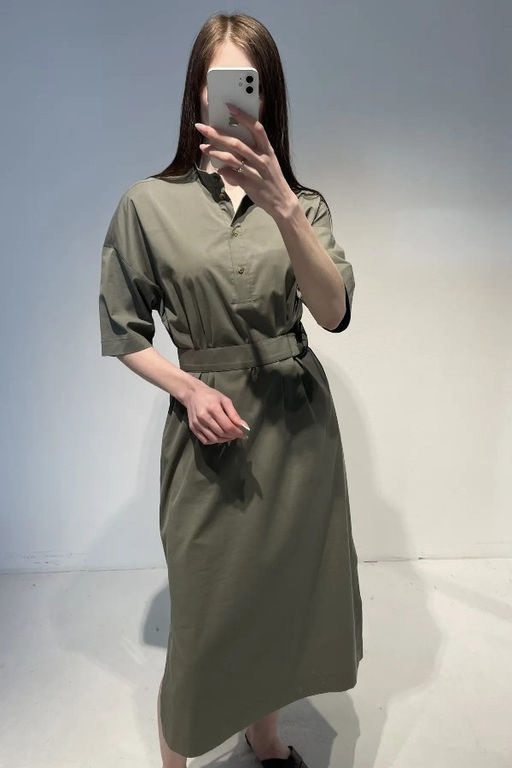 Платье из хлопковой ткани. Свободный силуэт с разрезами в боковых швах. По центру передней части изделия планка на пуговицах, в боковых швах карманы. Втачной короткий рукав в спущенную пройму. Линия горловины оформлена воротником-стойкой. На задней части изделия выполнена кокетка. В комплекте пояс из основной ткани. В таблице размеров представлены параметры человека, а не изделия.
