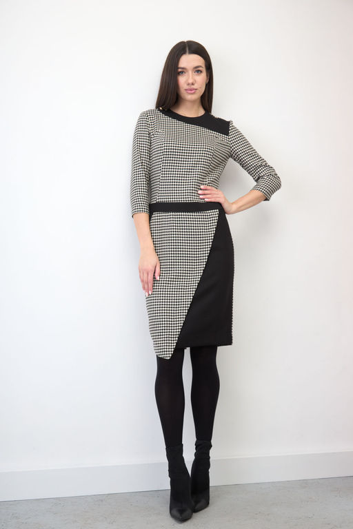 Состав: Платье: Вискоза-36%; ПЭ-62%; Эластан-2%; Отделка: Вискоза-33%; ПЭ-64%; Эластан-3%; Платье полуприлегающего силуэта, с ассиметричной складкой-запахом по переднему полотнищу юбки. В правом боку юбки расположен внутренний косой карман, планка которого служит однотонным декоративным элементом, также как и фигурная кокетка у горловины, притачной горизонтальный пояс, расположенный на завышенной линии бедра и вторая передняя часть полотнища юбки. Платье имеет округлую горловину. Верхняя часть платья состоит из фигурной кокетки, на которой расположены 2 декоративных пуговицы ( * фурнитура может отличаться от представленной на рекламном фотоматериале), рельефных конструктивных бочков для прилегания и центральной части. На спинке изделия находятся талиевые вытачки, в среднем шве расположена застежка-молния и деликатный открытый разрез. Рукав прямой, втачной, длина 3/4. Длина изделия рукава в готовом виде 44 см. Длина изделия платья по спинке 99 см. Фурнитура может отличаться от представленной на рекламном фотоматериале. Особые рекомендации: рекомендуется холодная деликатная ручная стирка, без использования отбеливающих СМС, без интенсивного трения. Сушка в вертикальном положении. ВТО с минимальным паром. -- Характеристики -- Состав: Платье- Вискоза-36%; ПЭ-62%; Эластан-2%; Отделка- Вискоза-33%; ПЭ-64%; Эластан-3%; Сезон: Весна Рост: 164 Страна бренда: Беларусь