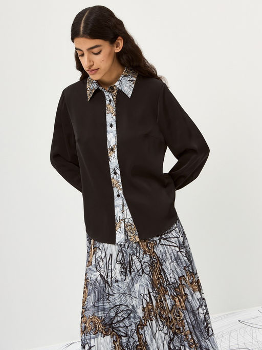 Блузка свободного кроя с потайной застежкой на пуговицы и длинными рукавами с манжетами. Золотой принт добавляет изысканности, создавая элегантный и расслабленный женственный образ. Изготовлена из струящейся ткани, которая мягко облегает фигуру, подчеркивая легкость и утонченность. Черный цвет с золотыми акцентами делает блузку универсальной она дополнит как вечерний, так и повседневный образ. Идеальный выбор для тех, кто ценит комфорт и стиль.