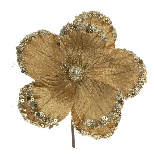 Прекрасный цветок из бархатистой ткани - это великолепное украшение для новогодней ели. Цветок украшен глиттером и пайетками, которые придают ему искрящийся блеск, дополняя праздничную атмосферу.