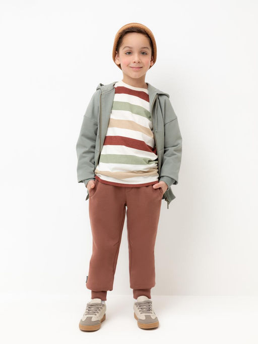 Однотонные брюки для мальчика из футера трехнитки с начесом. Эластичный пояс регулируется по ширине с помощью шнурка. У изделия эластичные манжеты и два кармана по бокам. Брюки сохраняют цвет и форму после многократных стирок.. Состав: 80% хлопок, 20% полиэстер