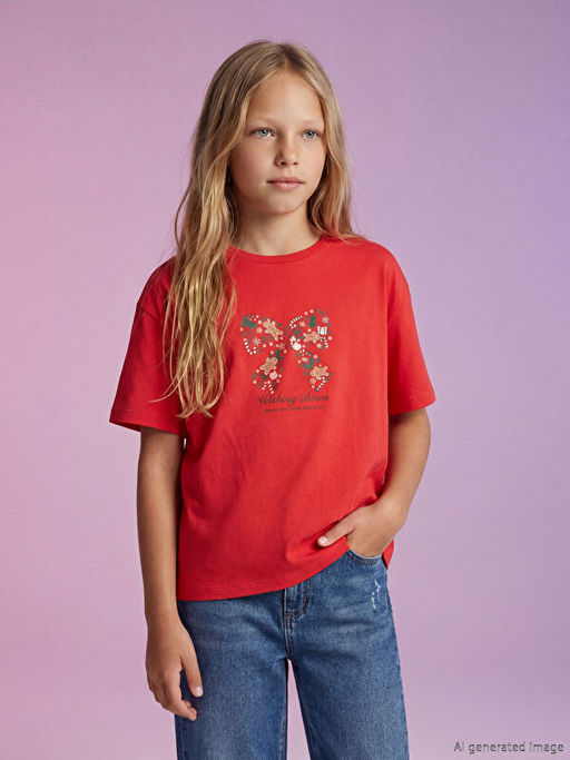• Bisiklet Yaka Bask?l? K?z ?ocuk Ti??rt