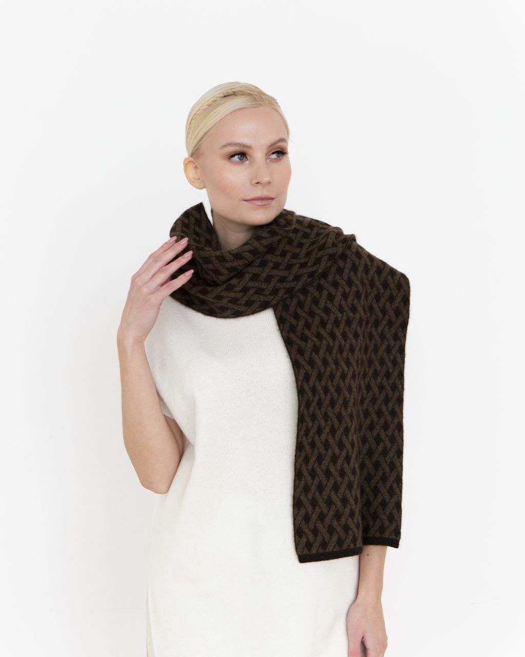 Cтрогий шарф из пуха яка универсален. Подчеркнет строгость образа как прекрасного пола, так и солидность сильного пола. Шарф представлен в темно-коричневом оттенке с орнаментом, станет идеальным заключающим деталью многих образов.­