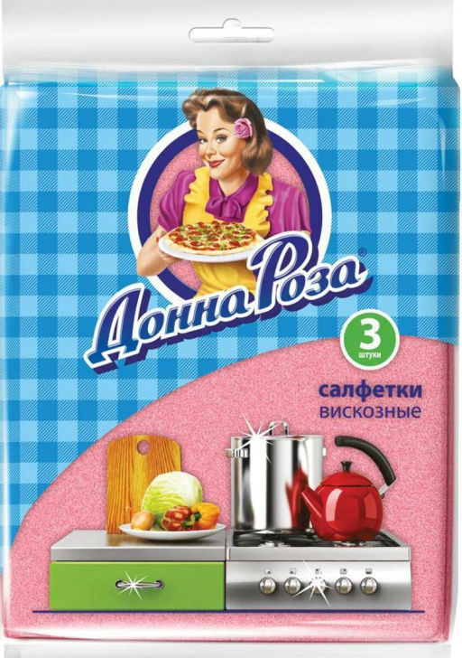 ДОННА РОЗА салфетки вискозные 3 шт. Состав: 50 % вискозы и 50 % полиэстера для прочности. Не оставляют мокрых следов и ворса. Мягкие на ощупь и быстро сохнут. Экономичная упаковка. Размер:30 х 38 см.