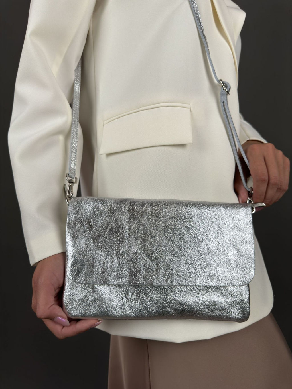 Страна: Италия Акции: Товары со скидкой Производитель: Pelletteria Luisa, Italy Размер: маленькая Стиль ношения: на ремешке через плечо Форма: мягкая Выделка кожи: зернистая износостойкая Цвет кожи: Серебряный Оттенок: серебристый металлик Упаковка: Пакет тканевый L, 40x40 см Палитра цветов: TB-105559 Размеры: длина: 23,5 см \tвысота: 14 см \tширина: 2 см Описание: Стильная женская сумка-клатч из натуральной кожи. коллекция Весна-Лето Sefaro, Италия. Сумочка имеет мягкую форму, компактная, выполнена из телячьей кожи, зернистой износостойкой выделки надежной и прочной, может использоваться как повседневная модель, но подойдет и для торжественного случая - элегантно дополнит вечерний образ по типу клатча, также органично подчеркнет сдержанный лук. Закрывается сумка внахлест и, дополнительно, на молнию, внутри 1 небольшое отделение и 1 боковой карман на молнии. Внутренняя отделка - качественная, водоотталкивающая, приятная на ощупь и долговечная в использовании, ткань. Используется итальянская фурнитура в серебряном цвете. В комплекте идет плечевой кожаный ремешок, который регулируется по длине. Можно носить в руке, как клатч, либо на ремешке через плечо - очень удобно!