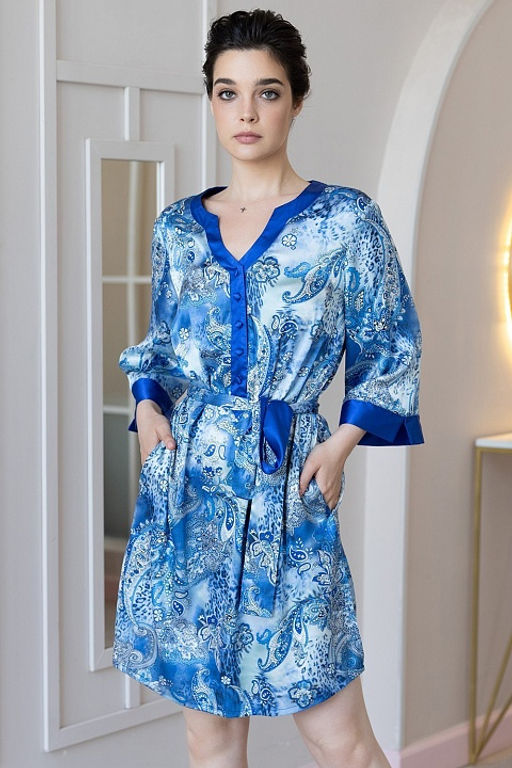 Туника Mia-Amore свободного покроя с рукавом длиной ?, выполнена из принтованной смесовой ткани. Планка и низ рукавов декорированы однотонным атласом. В боковых швах расположены карманы, а понизу разрезы.­