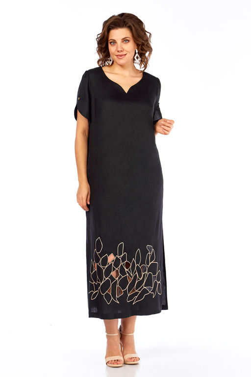 "Платье женское, прямого силуэта, выполнено из льняной ткани с фигурным вырезом по горловине. По переду обработаны нагрудные вытачки. Спинка цельнокроенная. Рукава втачные, по окату рукава сборка, нижний срез фигурной формы. Рукав декорирован навесной петлей и пуговицей. Платье дополнено дизайнерской вышивкой в стиле ришелье.