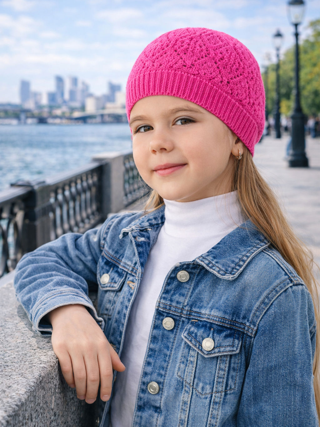 Детская легкая вязаная шапочка из мягкого акрила однотонного цвета. Связана ажурным узором ромбиками. По краю эластичная вязка. Благодаря этому плотно сидит на голове. Подходит для прохладной погоды летом. Эффектно завершит образ девочки.