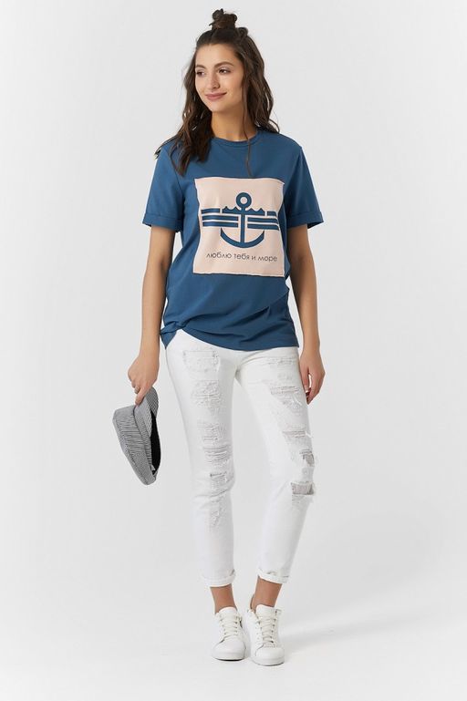 Особенности: Футболка прямого силуэта из трикотажа. Детали: горловина обработана бейкой, на переде настрочена декоративная деталь с принтом.