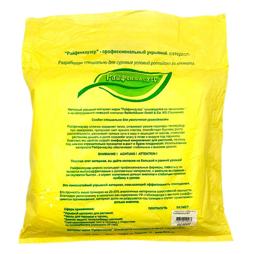 Укрывной материал Райфенхаузер - марка профессионального укрывного материала. Он идеально подходит для выращивания любых видов культур на протяжении всего дачного сезона. Характеристики: * тип: укрывной материал; * назначение: для парников и теплиц; * размер: 3,5х8м; * плотность: 60г/кв.м.; * цвет: белый. Достоинства: * сохраняет тепло, и сглаживает резкие перепады температур при заморозках, пропускает свет только нужного спектра, который способствует фотосинтезу и бурному росту растительности; * материал создает очень комфортный микроклимат, рассеивает прямые лучи в жару и защищает растения от ожогов, он позволяет дышать и сохраняет влажной почву; * с успехом применяется для покрытия стальных каркасов крупных теплиц; * служит прекрасной альтернативой поликарбонату, так как создает гораздо более комфортные условия для развития растений, при этом намного дешевле поликарбоната и более удобен для монтажа и демонтажа; * очень актуален в условиях суровых российских зим: стальные каркас ы теплицы нет необходимости усиливать материал легко снимается после сезона и никакая снежная зима ему не страшна.