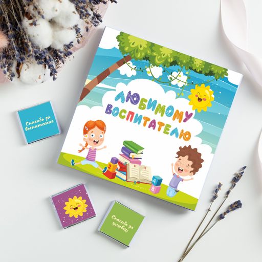 Каждая шоколадка упакована в индивидуальную этикетку с пожеланием.