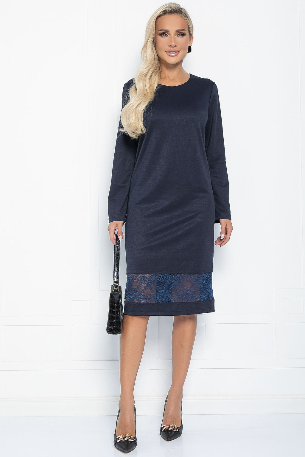 Артикул: П11119. Тип ткани: смесовая. Состав: 65% полиэстер, 30% вискоза, 5% эластан. Материал: трикотаж и кружево. Цвет: тёмно-синий. Принт: отсутствует. Длина: миди. Вид застежки: пуговица. Силуэт: полуприлегающий. Карманы: отсутствуют. Подкладка: отсутствует. Декоративные элементы: кружевная вставка по переду платья. Длина по спинке от верхней точки плеча: 44/ 102 см, 46-48/ 103 см, 50/ 104 см, 52/ 105 см. Размер изделия на модели: 44. Рост модели: 168 см. Тёмно-синее платье с красивой кружевной вставкой идеальный вариант как для офиса, так и для повседневного образа. Вставка из кружева придаёт платью изысканность и делает его более интересным. Длина миди позволяет считать это платье универсальным, ведь оно подчёркивает женственность и стиль своей обладательницы. Уход за изделием: ручная стирка до 30 градусов; нельзя отбеливать; отжим запрещён; гладить при t не более 110 С; гладить с изнанки. Внимание! Рекомендуем ориентироваться на размерную сетку и выбирать свой привычный размер, согласно размерной таблице. *Допуск отклонения длины при массовом производстве 1-3 см является нормой. -- Характеристики -- Цвет: тёмно-синий