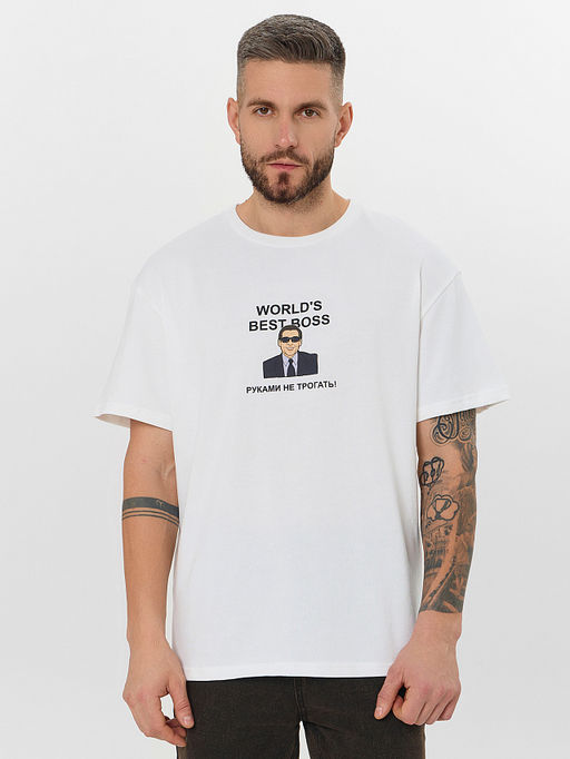 Белая футболка с принтом и надписью Лучший босс в мире. Руками не трогать это стильное проявление чувства юмора. Её свободный крой со спущенным плечом обеспечивает расслабленную и комфортную посадку, позволяя принту стать центром внимания.