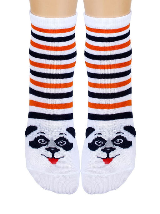 Детские полосатые носки. Благодаря натуральному гребенному хлопку в составе модель создаст ощущения комфорта и лёгкости, а добавление синтетических нитей обеспечит эластичность и устойчивость к истиранию. Цветную полоску дополняет мордочка панды дизайн, который, несомненно, придётся по вкусу каждому ребёнку.