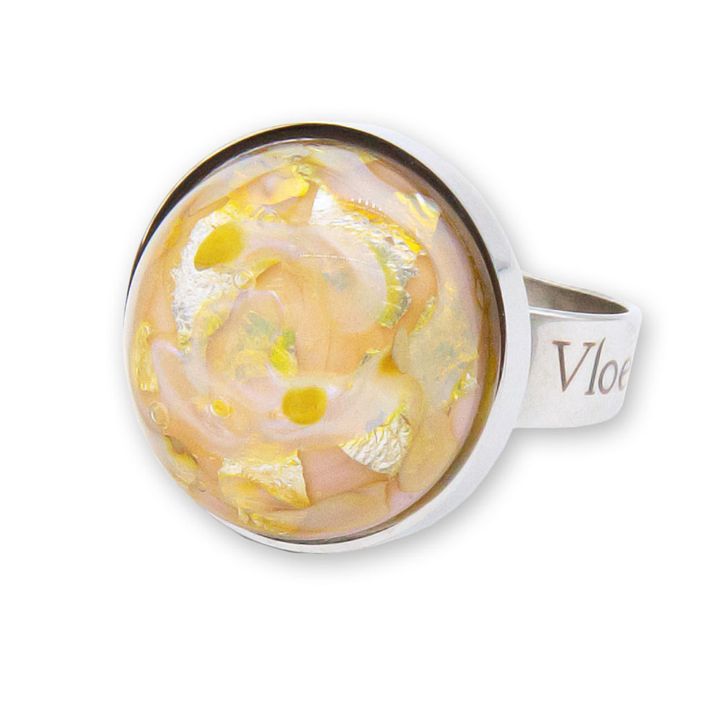 Кольцо изготовлено из муранского стекла и гипоаллергенной ювелирной стали, что очень важно для людей с чувствительной кожей. Металл не темнеет и не подвергается воздействиям окружающей среды, надолго обеспечивая красивый внешний вид изделия. Диаметр стеклянного элемента - 2 см. Кольцо безразмерное, регулируется с 16 до 19 размера. Вес - 8 гр.