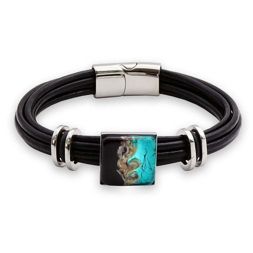 Браслет изготовлен из муранского стекла, натуральной кожи и гипоаллергенной ювелирной стали, что очень важно для людей с чувствительной кожей. Металл не темнеет и не подвергается воздействиям окружающей среды, надолго обеспечивая красивый внешний вид изделия. Крепкий магнитный замок с двойной защитой надежно фиксируется на запястье. Ширина браслета - 1,5 см. Размер стеклянного элемента - 1,6x1,6 см. Вес - 21 гр.