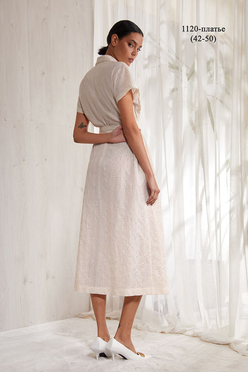 Платье А- образного силуэта, выполнено из тонкого кружевного фактурного хлопка ( шитье). Длина мidi. Двубортная застежка на петли и пуговицы. Воротник пиджачного типа. На полочке накладные карманы, декорированы хлопковым кружевом. Спинка прямая. В боковых швах карманы. Чуть спущенная линия плеча. Прямой короткий рукав.